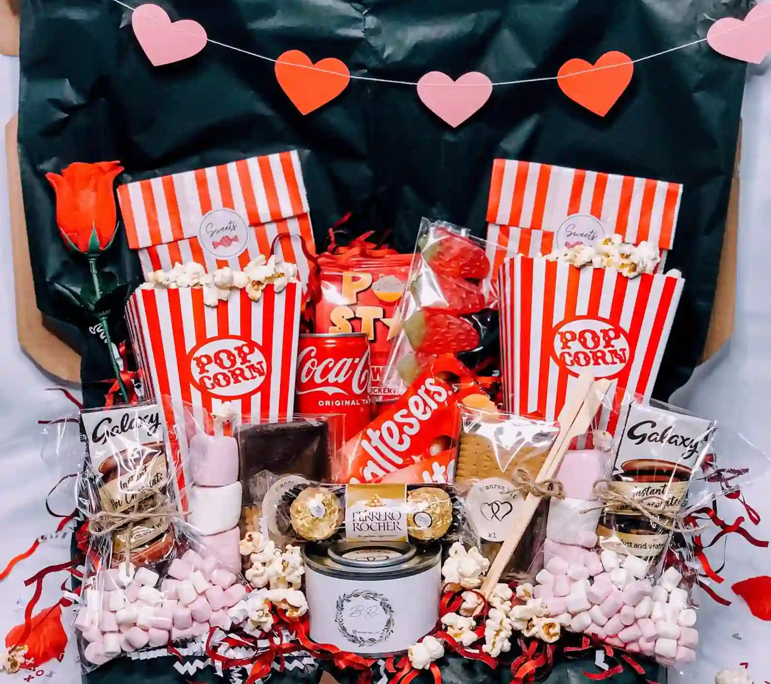 This movie box has everything you need for a delightful (and delicious) evening, including two cardboard popcorn boxes, one microwave popcorn packet, two sweet packets, giant strawberries or giant sticks, two Coca-Cola cans, two hot chocolate sachets with marshmallows, four Ferrero Rochers or a sharing Dairy Milk bar, and two Maltesers packets.