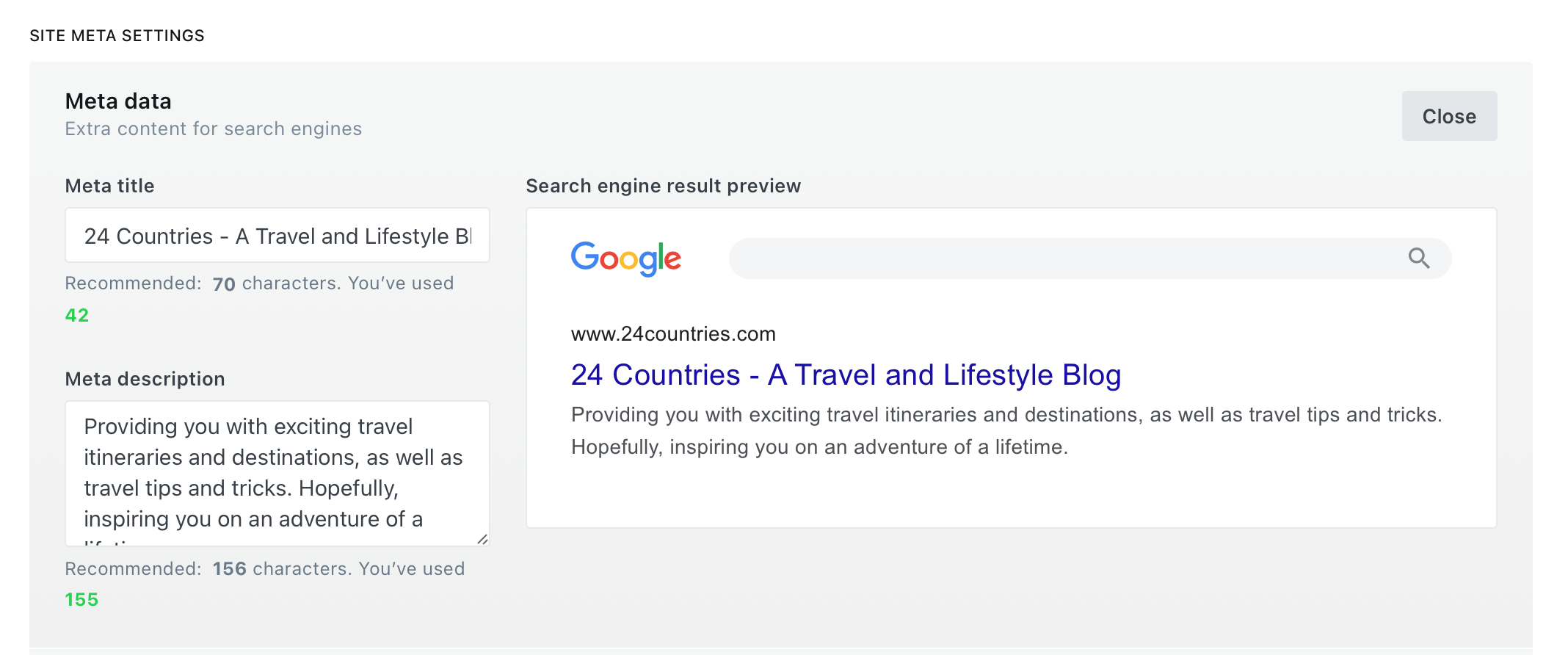 You have 156 characters to use to write your meta description. Use as many characters as possible to try and perfectly describe the purpose of your site (make sure you state your niche!). For example, being a travel blog, I'm trying to provide others with travel itineraries to inspire them to go on an adventure of a lifetime so I wanted to use this in my description. This tells others exactly what my site is all about.