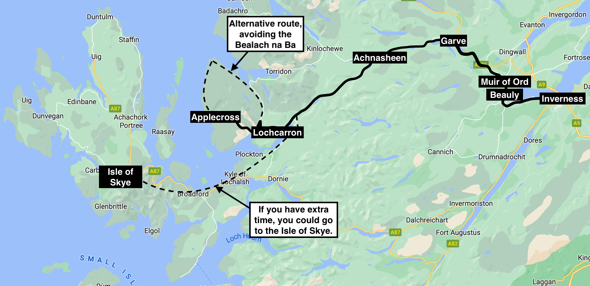 Factoring in the Bealach na Ba, the following are the roads you will take to get from Applecross to Inverness.